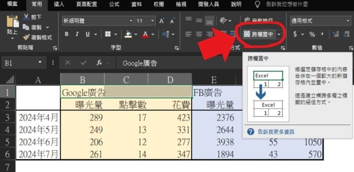 最常對標題行或標題列合併儲存格,不只節省空間,還能使表格更容易理解,比如說以下 Google 廣告與 FB 廣告數據結果,合併後會更容易看懂。
